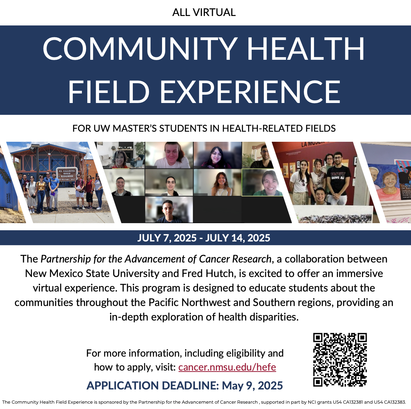 The Partnership for the Advancement of Cancer Research (PACR), a collaboration between New Mexico State University and Fred Hutch, is pleased to offer an all-virtual experience regarding community health.  This field experience will provide an intensive look at health disparities in communities across New Mexico and the Pacific Northwest.